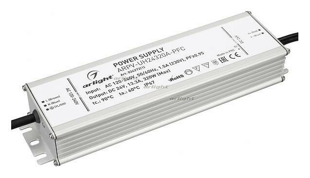 Источник напряжения с гальванической развязкой для светодиодных изделий. Входное напряжение 120-240 VAC. Выходные параметры: 24 В, 13,3 А, 320 Вт. Встроенный PFC >0,95. Герметичный алюминиевый корпус IP 67. Рабочая температура -40…+70C⁰. Габаритные размеры длина 251 мм, ширина 67.5 мм, высота 38.5 мм. Гарантийный срок 7 лет.