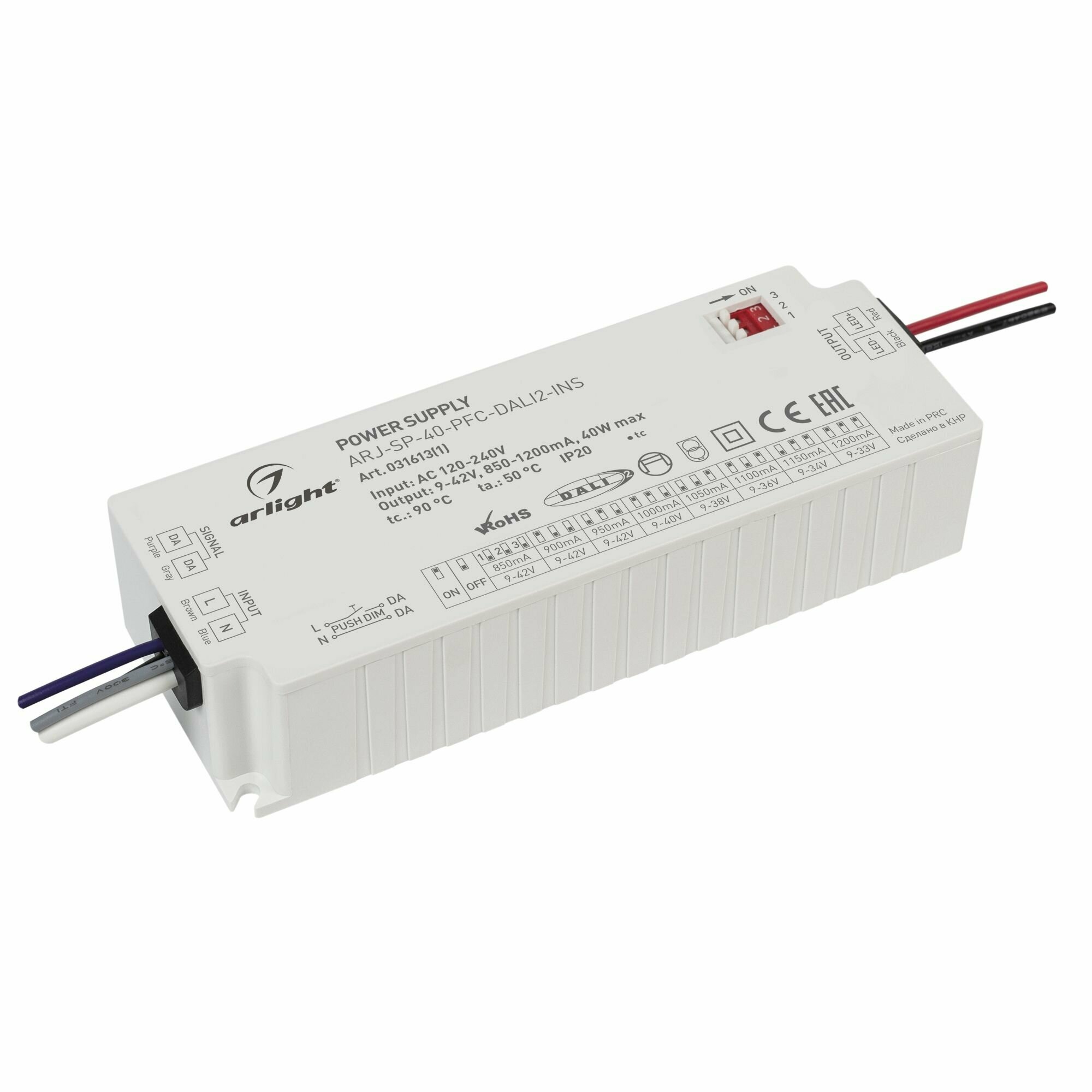 Диммируемый источник тока по протоколу DALI 2.0 (диапазон 0.1-100%) с гальванической развязкой для светильников и мощных светодиодов. Входное напряжение 120-240 VAC. Выходные параметры: 9-42V - 850/900/950mA, 9-40V - 1000mA, 9-38V - 1050mA, 9-36V - 1100mA, 9-34V - 1150mA, 9-33V - 1200mA (дип-переключатель на корпусе), макс. мощность 40W. Встроенный PFC >0.95. Негерметичный пластиковый корпус IP 20. Габаритные размеры длина 121 мм, ширина 44 мм, высота 27 мм. Гарантийный срок 5 лет.