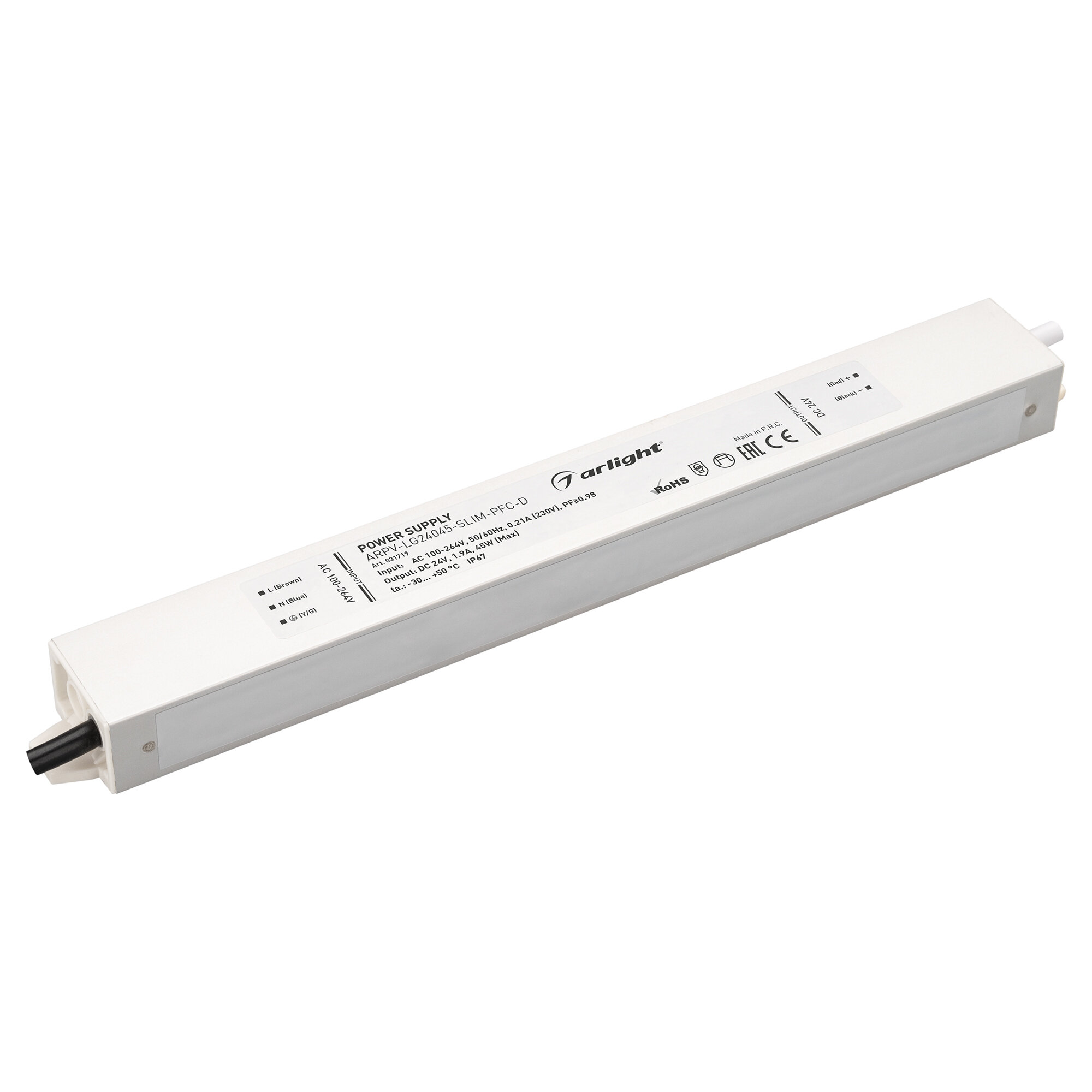 Источник напряжения с гальванической развязкой для светодиодных изделий. Входное напряжение 200-240 VAC. Выходные параметры: 24 В, 1.9 А, 45 Вт. Встроенный PFC >0.98. Герметичный алюминиевый корпус IP 67. Рабочая температура -30…+50C⁰. Габаритные размеры длина 263 мм, ширина 30 мм, высота 20 мм. Гарантийный срок 5 лет.