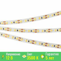 Светодиодная лента RT серии A120. Светодиоды SMD 2835, 120 шт/м, белая плата шириной 8 мм, скотч 3M. Цвет теплый 3500K, индекс цветопередачи CRI>85, угол 120°. Питание 12 В, мощность 9.6 Вт/м (48 Вт на 5 м). Размеры 5000x8x1.5 мм. Мин. отрезок 25 мм, 3 светодиода. .
