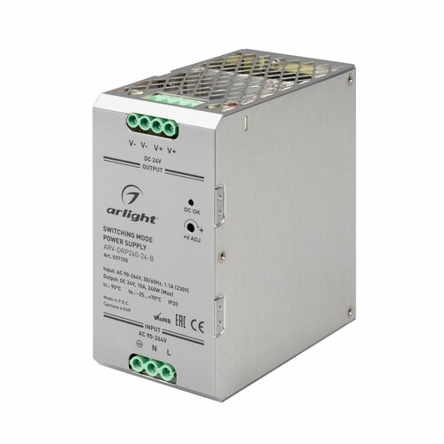 Источник напряжения с гальванической развязкой для светодиодных изделий. Входное напряжение 100-240 VAC. Выходные параметры: 24 В, 10 А, 240 Вт. Негерметичный металлический корпус IP 20 для установки на DIN-рейку. Встроенный PFC >0,95 Габаритные размеры длина 113 мм, ширина 63 мм, высота 125 мм. Гарантийный срок 5 лет.