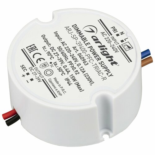 Диммируемый источник тока по стандарту TRIAC с гальванической развязкой для светильников и мощных светодиодов. Входное напряжение 220-240 VAC. Выходные параметры: 27-39 В, 400 mА, 15 Вт. Встроенный PFC >0,92. Негерметичный пластиковый корпус IP 44. Габаритные размеры: диаметр в окружности Ø51 мм, высота 22 мм. Гарантийный срок 5 лет.