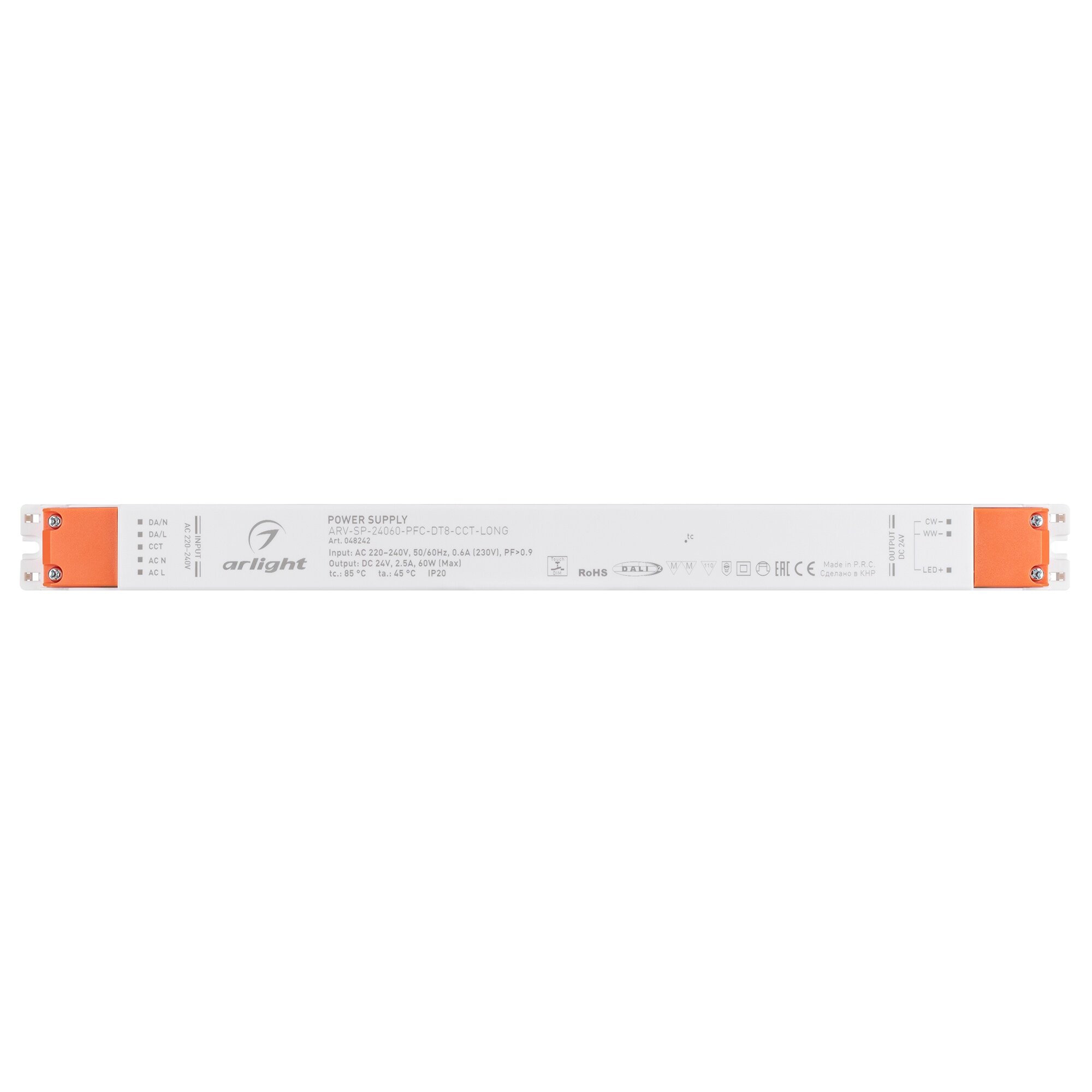Источник напряжения с возможностью диммирования и регулировки цветовой температуры по протоколу DALI2 DT8 с гальванической развязкой для MIX (CCT) светодиодных лент. Встроены функции PUSH DIM, PUSH CCT. Входное напряжение 220-240 VAC. Выходные параметры: 24 В, 2.5А (максимальный суммарный ток на два канала), 60 Вт. Встроенный PFC >0.9. Негерметичный пластиковый корпус IP 20. Габаритные размеры длина 361.5 мм, ширина 30 мм, высота 21.3 мм. Гарантийный срок 5 года.