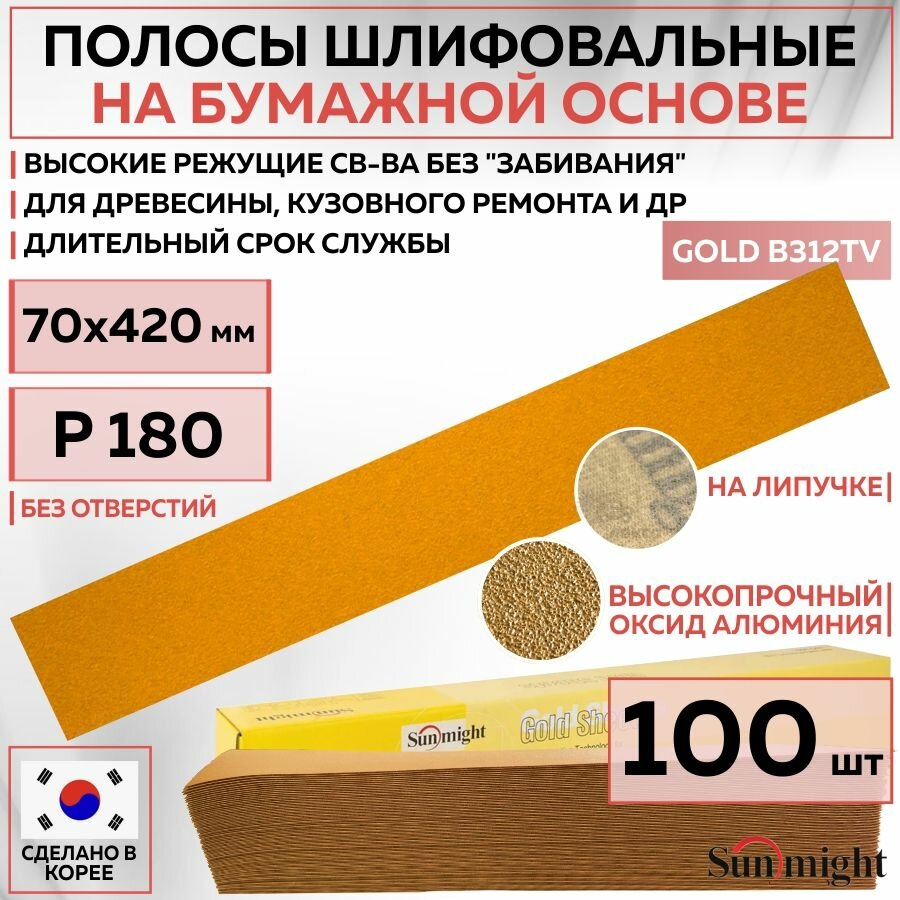Купить 05410 Шлифовальные абразивные полосы SUNMIGHT GOLD B312TV на бумажной основе, 70 x 420 мм, P180, без отверстий, 100 шт полос/упак. с доставкой по всей России.