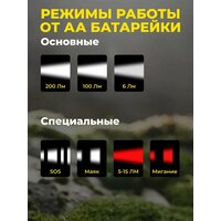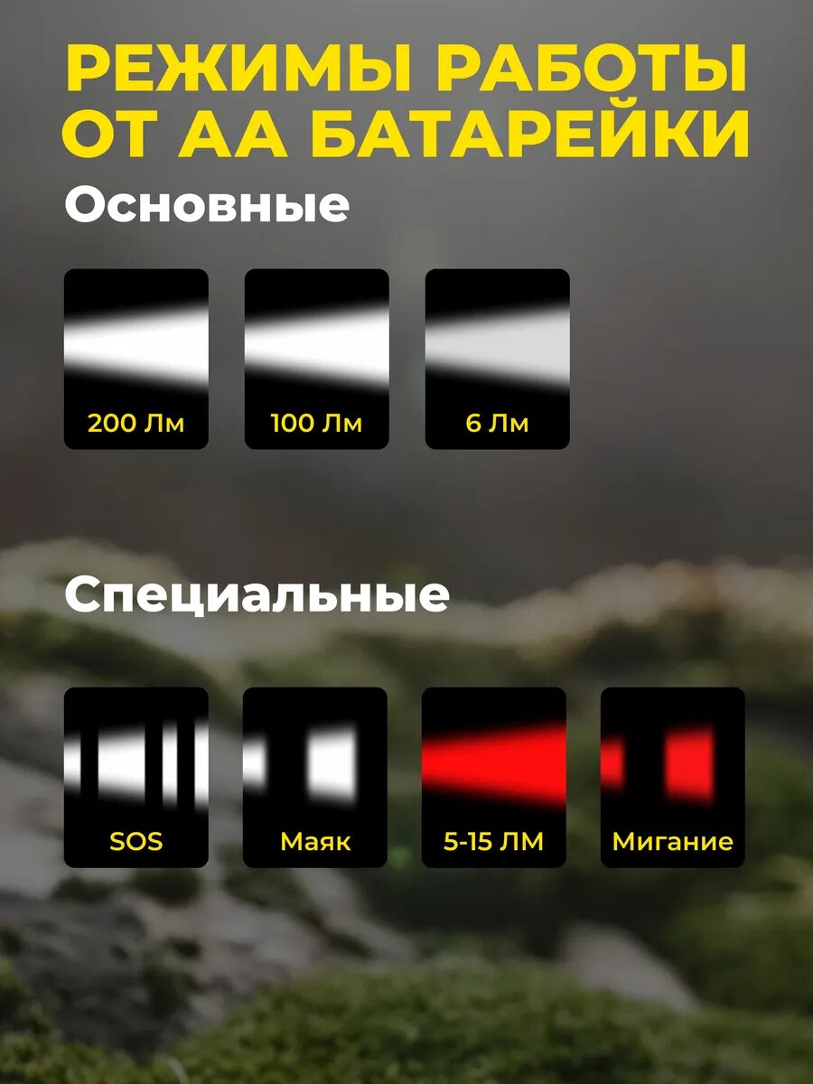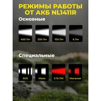 Световой поток до 400 люмен; Высокоэффективные светодиоды UHE; Основной белый и дополнительный красный свет; Оптическая матричная система линз с различными гранями; Время работы до 114 часов; Широкий диапазон напряжений и совместимость с различными батареями типа АА, включая щелочные, никель-металл-гидридные, литий-железные и литий-ионные; В комплект входит 1 щелочная батарея типа АА; Две кнопки, отличающиеся по форме и фактуре, обеспечивают простое и интуитивно понятное управление одной рукой; 4 уровня яркости белого света, 3 специальных режима и 2 уровня яркости красного света; Изготовлен из специального поликарбонатного пластика и материала TPE Сверхлегкий, что обеспечивает удобство при длительном ношении; Ударостойкость позволяет выдержать падение с высоты до 1 метра; Степень водо- и пыленепроницаемости в соответствии со стандартом IP66. Размеры: 67,4 мм x 28,6 мм x 33,4 мм (2,65"x 1,13" x 1,31") Вес: 65 г (2,29 унции) (с учетом щелочной батареи типа AA и налобного крепления) 43 г (1,52 унции) (только налобное крепление)