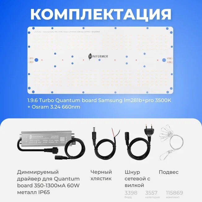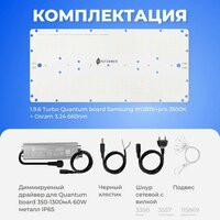 Комплект: 1.9.6 Turbo Quantum board Samsung lm281b+pro 3500K + Osram 3.24 660nm Диммируемый драйвер для Quantum board 350-1300мА 60W металл IP65 Черный хлястик Черный сетевой провод 100 см для подключения драйвера Подвес для фитоламп и Quantum board