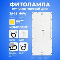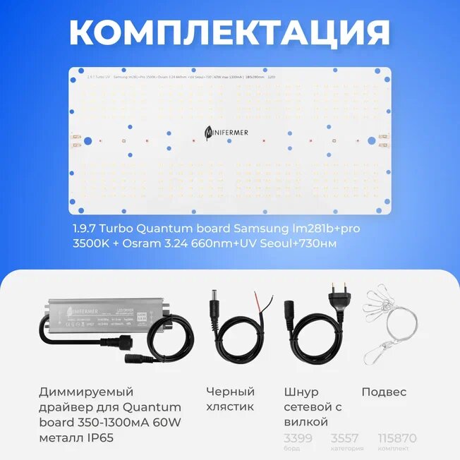 Комплект: 1.9.7 Turbo Quantum board Samsung lm281b+pro 3500K + Osram 3.24 660nm+UV Seoul+730нм Диммируемый драйвер для Quantum board 350-1300мА 60W металл IP65 Черный хлястик Черный сетевой провод 100 см для подключения драйвера Подвес для фитоламп и Quantum board