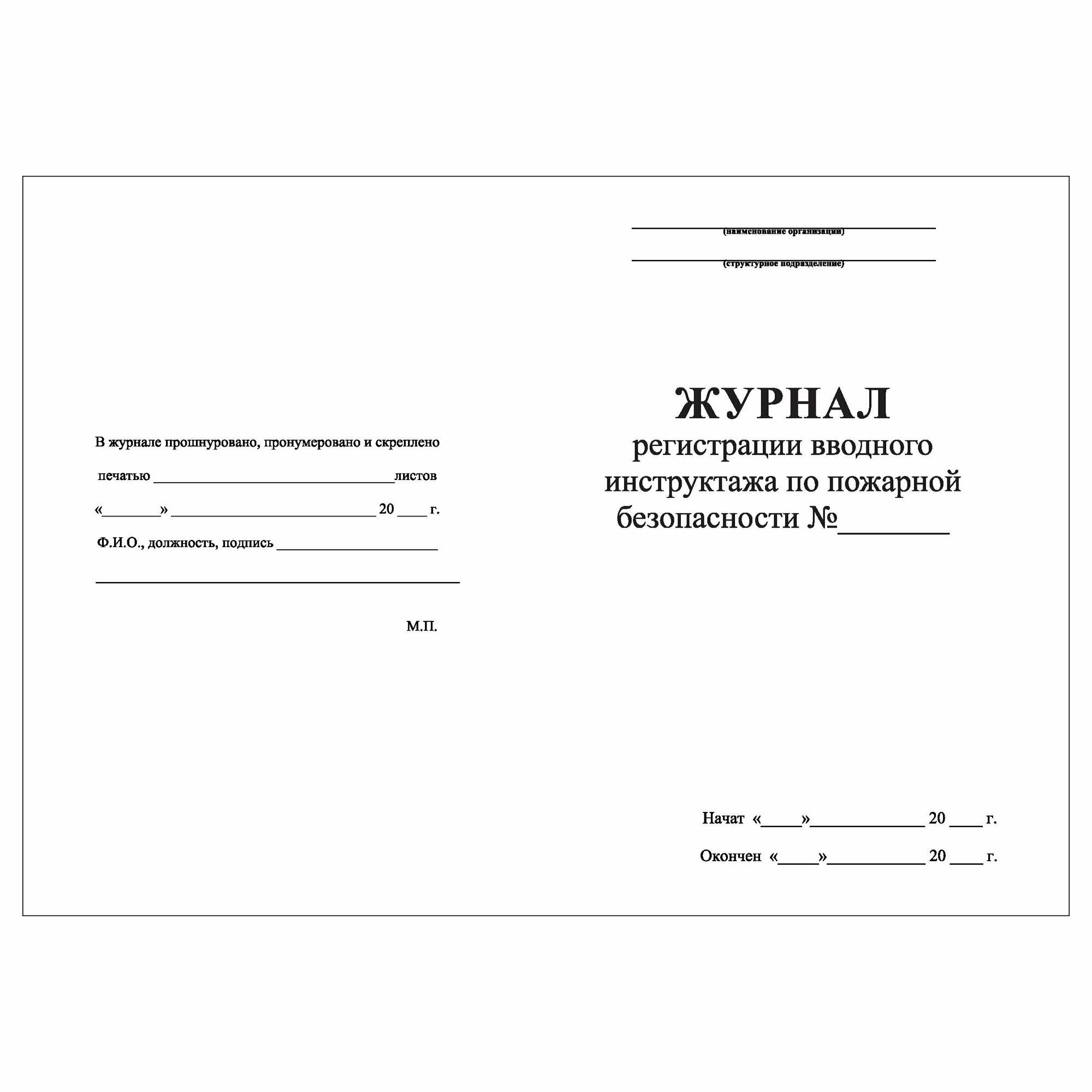 Журнал с полистовой нумерацией, 500 страниц (250 листов) в блоке, в твердом переплете. Изготовлен по ГОСТ. Журнал регистрации вводного инструктажа по пожарной безопасности содержит следующие графы:
