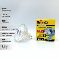 (10 шт.) Низковольтная галогенная лампочка Navigator MR16, мощность 35 Вт, напряжение питания 12 В, цветовая температура 3000 К, теплый белый свет, цоколь GU5.3, диммируемая, размер 51х50 мм: сравнение цен, характеристики, фото, актуальное наличие и цены.