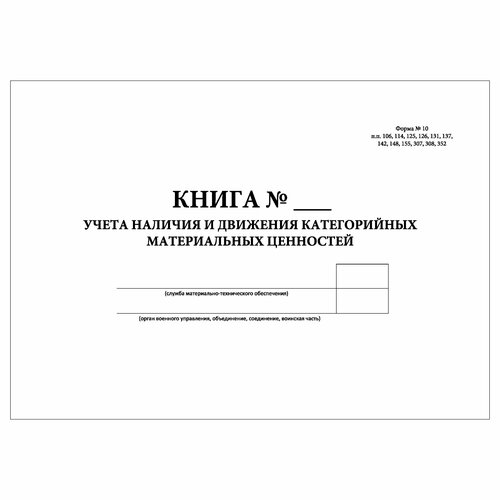 Журнал с полистовой нумерацией, 200 страниц (100 листов) в блоке, обложка из тонкого картона, плотностью 200 г/м2. Изготовлен по ГОСТ. Книга учета наличия и движения категорийных материальных ценностей (Форма № 10) Формат А3 содержит следующие разделы: Пояснения к форме содержание Разворот: 1. Дата записи 2. Наименование документа 3. № документа 4. Дата документа 5. Поставщик (получатель) 6. Прибыло 7. Убыло 8. Состоит/ Всего 9. Состоит/ из них по категориям (сортам)/ I 10. Состоит/ из них по категориям (сортам)/ II 11. Состоит/ из них по категориям (сортам)/ III 12. Состоит/ из них по категориям (сортам)/ IV 13. Состоит/ из них по категориям (сортам)/ V 14. Из них состоит/ на складе/ Всего 15. Из них состоит/ на складе/ из них по категориям (сортам)/ I 16. Из них состоит/ на складе/ из них по категориям (сортам)/ II 17. Из них состоит/ на складе/ из них по категориям (сортам)/ III 18. Из них состоит/ на складе/ из них по категориям (сортам)/ IV 19. Из них состоит/ на складе/ из них по категориям (сортам)/ V 20-25. Из них состоит/ 26-45. В подразделениях, воинских частях, соединениях, объединениях
