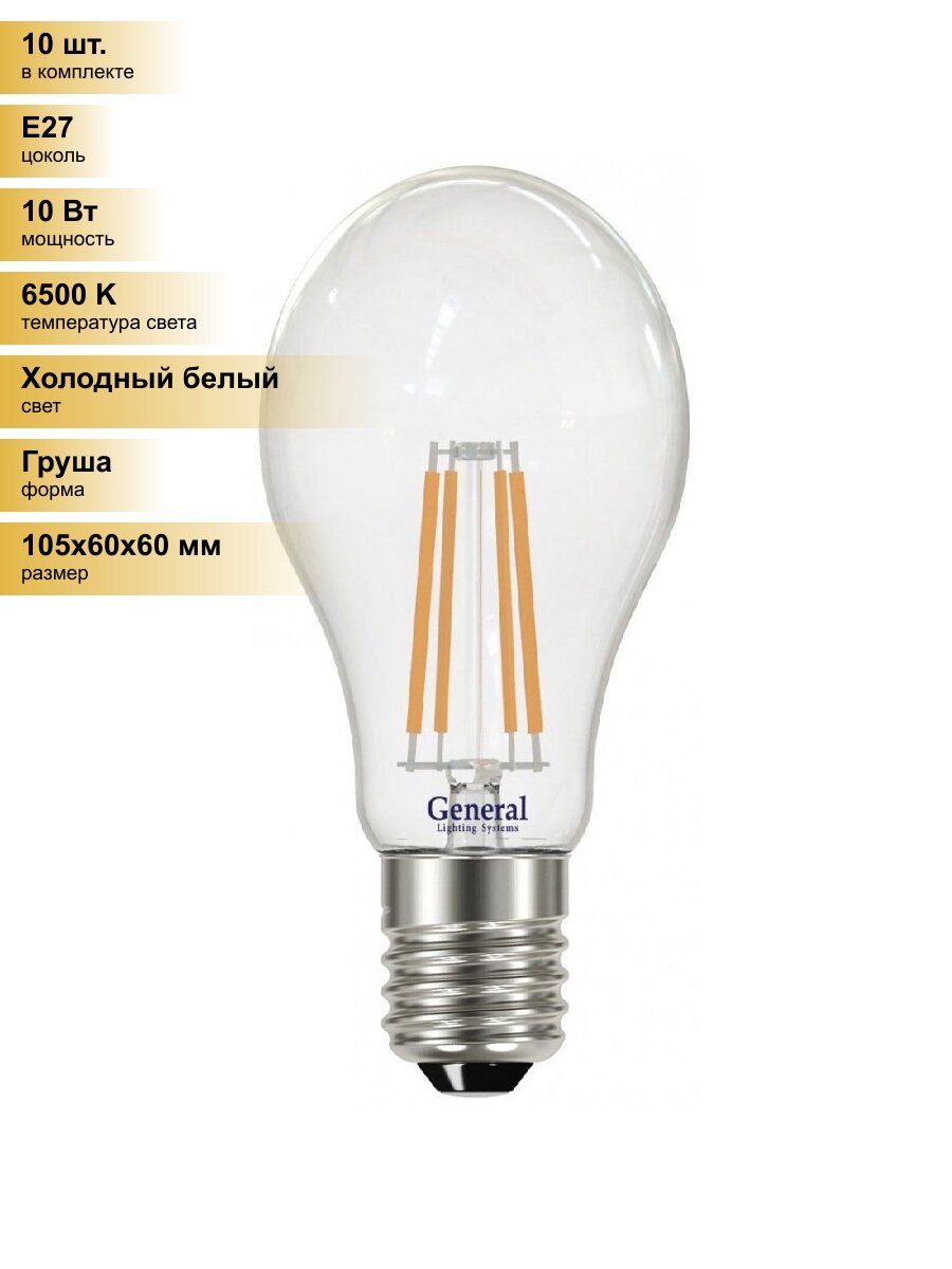 (10 шт.) Светодиодная лампочка General ЛОН A60 E27 10W 6500K 6K 60×105 филамент (нитевидная) прозр. 649300 Холодный белый. Цоколь E27: сравнение цен, характеристики, фото, актуальное наличие и цены.