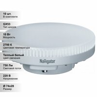 (10 шт.) Светодиодная лампочка Navigator, мощность 10 Вт, напряжение питания 220 В, цветовая температура 2700 К, теплый белый свет, цоколь GX53, таблетка, размер 74х28 мм