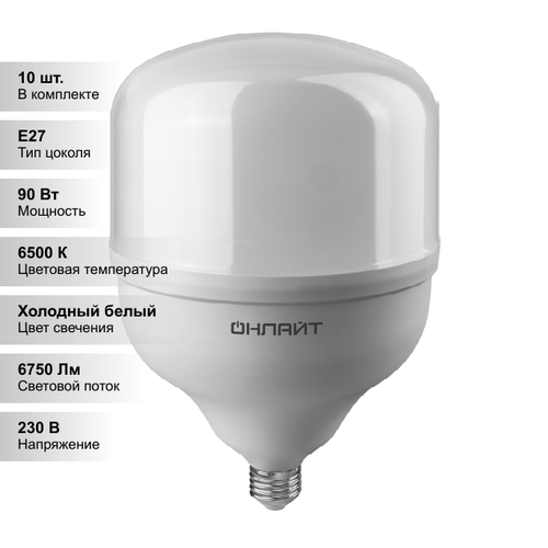Онлайт OLL-T160-90-230-865-E27E40 82 909 Высокоэффективные планарные светодиоды Epistar Алюминий и композитные материалы в составе радиаторов обеспечивают эффективный теплоотвод Высокоэффективный драйвер обеспечивает стабильную работу в широком диапазоне входных напряжений Сглаженные пульсации светового потока Диапазон рабочих температур от -40 до +40 °С Срок службы 30 000 часов