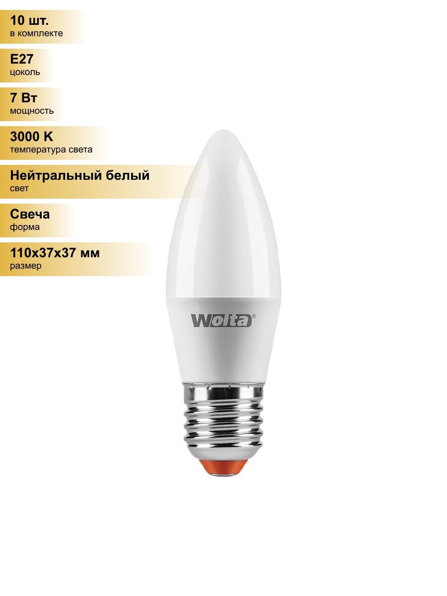 (10 шт.) Светодиодная лампочка Wolta лампа св/д свеча C37 E27 7,5W(625Lm) 3000K 2K 100X37 25YC7.5E27 Нейтральный белый. Цоколь E27: сравнение цен, характеристики, фото, актуальное наличие и цены.
