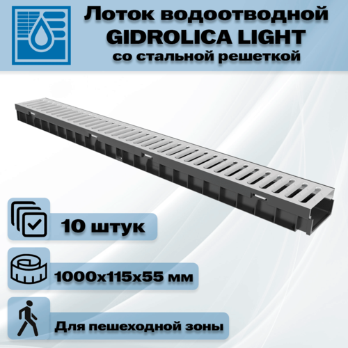 10 штук лоток водоотводный 1000х115х55 мм Gidrolica Light с оцинкованной щелевой решеткой DN100 (А15), артикул 080096, черный: сравнение цен, характеристики, фото, актуальное наличие и цены.
