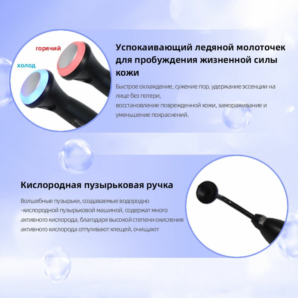 Аппарат для гидродермабразии "10 в 1" сочетает в себе 10 эффективных функций, которые преобразят кожу ваших клиентов и обеспечат вашему заведению безупречную репутацию. Этот универсальный функционал гарантирует красоту, свежесть и молодость кожи лица посетителей вашего салона красоты: устройство имеет 10 функций. Инструкция по применению 1. Прохладный и теплый массажер (лоб, лицо) 10 °C по Цельсию - способствует подтяжке кожи, сохраняет ее эластичность; сужает поры; уменьшает морщины, покраснение кожи, отеки и боль; Борется с повторными угрями. 42 °C по Цельсию - помогает расслабить мышцы, стимулирует и ускоряет кровообращение; устраняет токсины на лице и угри, загрязненные при глубоком очищении. 2. Ультразвук (глаза) Ускоряет впитывание эссенции. Улучшает обмен веществ в коже вокруг глаз. Устраняет темные круги и морщины. 3. RF (глаза) Нагревает ткани кожи в фиксированном положении, что делает кожу толще, а морщины исчезают или становятся светлее. Реорганизация структуры коллагена кожи для выработки нового коллагена подтягивает кожу. 4. Ультразвук (лоб, лицо) ускоряет усвоение питательных веществ эссенции, ускоряет метаболизм кожи, способствует активации клеток; улучшает 5. Скруббер для кожи (лоб, нос, лицо): Быстрое распыление воды с помощью высокочастотной вибрации деликатно отшелушивает кожу для достижения эффекта очищения. 6. Ручка с пузырьками воды: глубокое очищение кожи. отшелушивание кожи и удаление угрей. 7. Массажная доска для выскабливания лица: Подтяжка кожи гиалуроновой кислотой для придания коже упругости и формы лица. 8. Кислородный спрей: равномерно нанесите эссенцию или тонер на лицо с давлением 0,2 Кпа для омоложения кожи и устранения морщин. 9. Волшебный шар-массажер: Волшебный шар-массажер активирует кожу лица, проникает в мышцы и делает меридианы более открытыми, гладкими, красивыми и сияющими. 10. Пузырьковая ручка, активирующая кислород: Плотные пузырьки помогают глубоко очистить кожу и проникают в нее для удаления загрязнений.