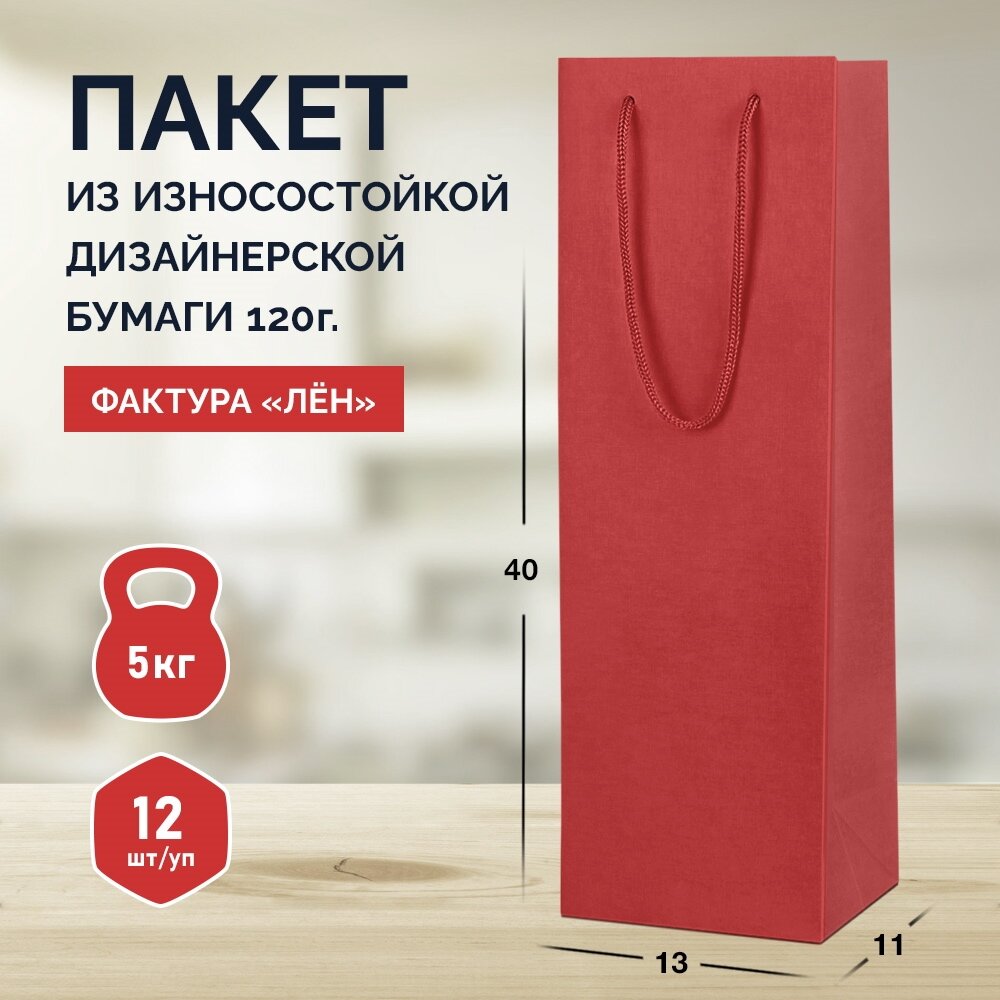 Минимальная партия (пачка): 12 шт. Цвет: красный Размер (ш*в*г): 13*40*11 Материал: дизайнерская бумага с тиснением лен 120 гр. Ламинация: Нет Ручки: красный шнур пп, 5 мм Габариты пачки (ш*в*г): 13*40*6 Максимальная нагрузка: 5 кг Плотность 120 гр.