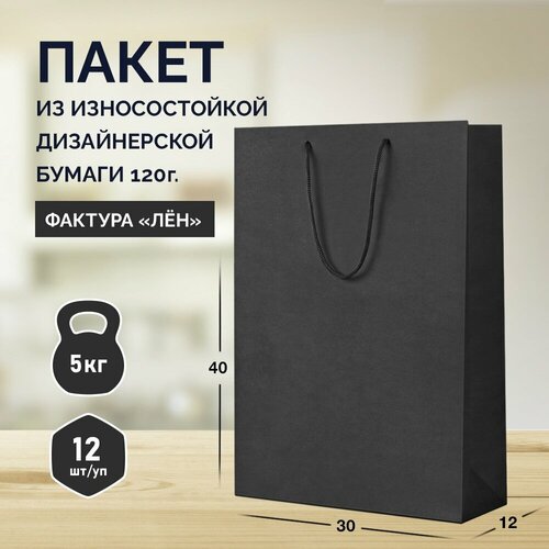 Минимальная партия (пачка): 12 шт. Цвет: черный Размер (ш*в*г): 30*40*12 Материал: дизайнерская бумага с тиснением лен 120 гр. Ламинация: Нет Ручки: черный шнур пп, 5 мм Габариты пачки (ш*в*г): 30*40*6 Максимальная нагрузка: 6 кг Плотность 120 гр.