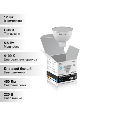 (12 шт.) Светодиодная лампочка Gauss MR16 5.5Вт 220В 4100К GU5.3