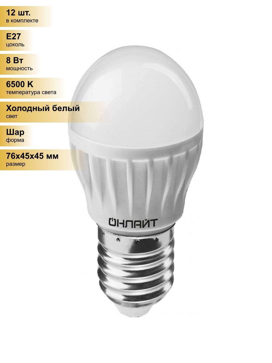 (12 шт.) Светодиодная лампочка онлайт шар G45 E27 8W(640Lm) 6500K 6K 76×45 OLL-G45-8-230-6.5K-E27 61137 Холодный белый. Цоколь E27: сравнение цен, характеристики, фото, актуальное наличие и цены.