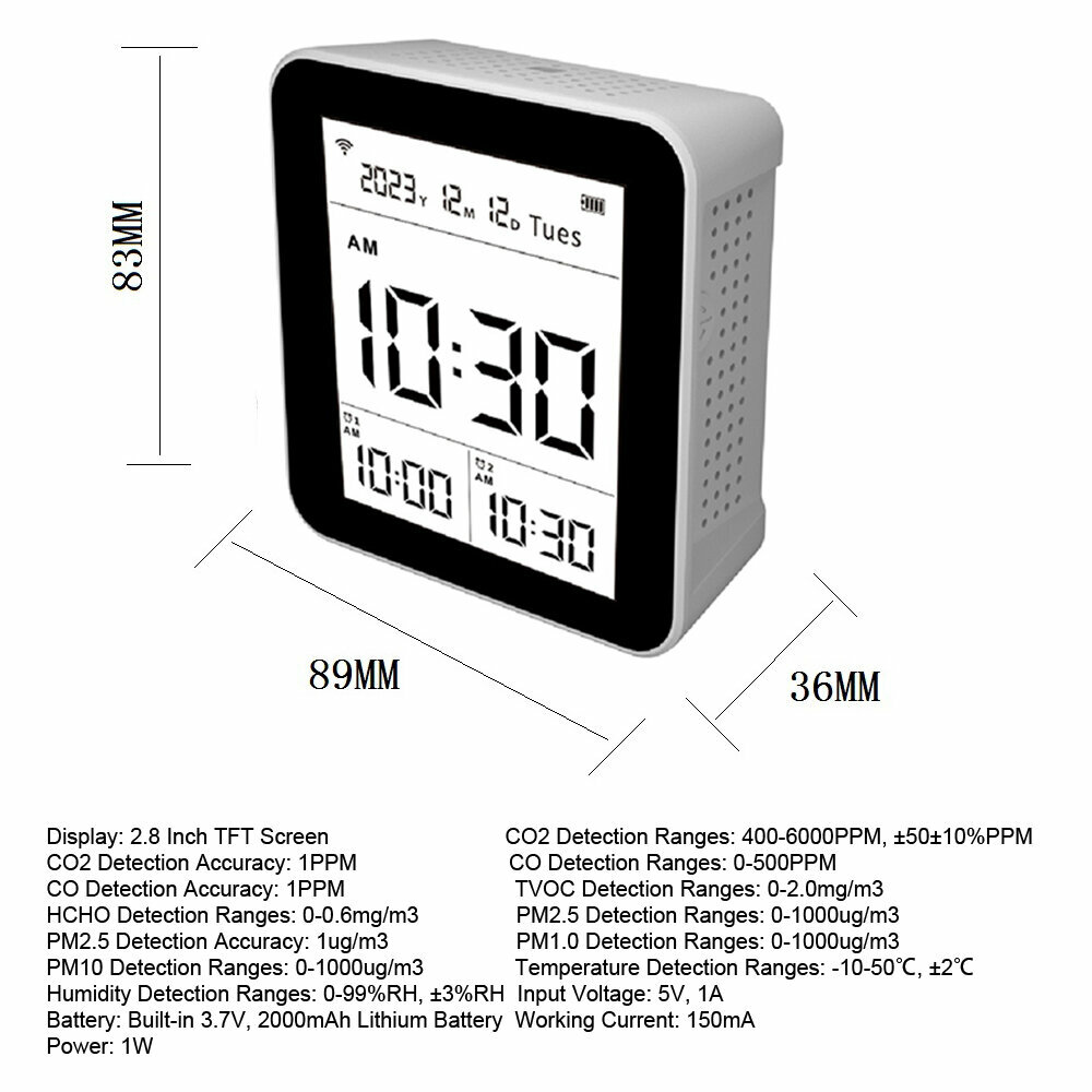 14 В 1 TUYA Wi -Fi Интеллектуальный монитор качества воздуха Монитор качества воздуха в помещении CO2 CO2/CO/TVOC/HCHO/PM2.5/PM1.0/PM10/Температура/Влажность/время/дата/тревога/таймер/Стокол: сравнение цен, характеристики, фото, актуальное наличие и цены.