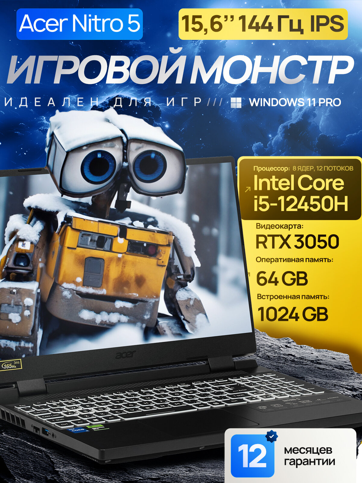 Купить 15.6″ Игровой ноутбук Acer Nitro 5 AN515, 144 Hz Full HD, Intel Core i5-12450H (8 Ядер, 4.4 ГГц), RAM 64 ГБ, SSD 1 ТБ, NVIDIA GeForce RTX 3050 (4 Гб GDDR6), Windows 11 Pro + Microsoft Office 2021 Pro Plus, Русская раскладка, EAC с доставкой по всей России.