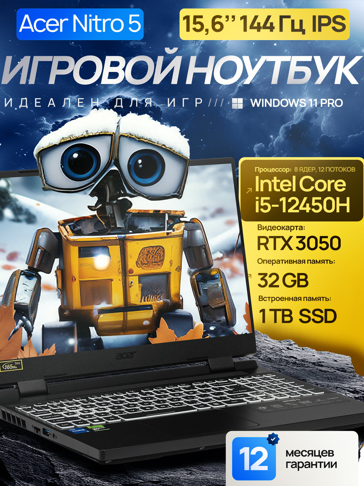 15.6″ Игровой ноутбук Acer Nitro 5, Full HD 144 Hz IPS, Intel Core i5-12450H (4.4 ГГц), RAM 32 ГБ, SSD 1 ТБ, NVIDIA GeForce RTX 3050 (4 Гб), Windows 11 Pro + Office 2021 Pro Plus, Русская раскладка: сравнение цен, характеристики, фото, актуальное наличие и цены.