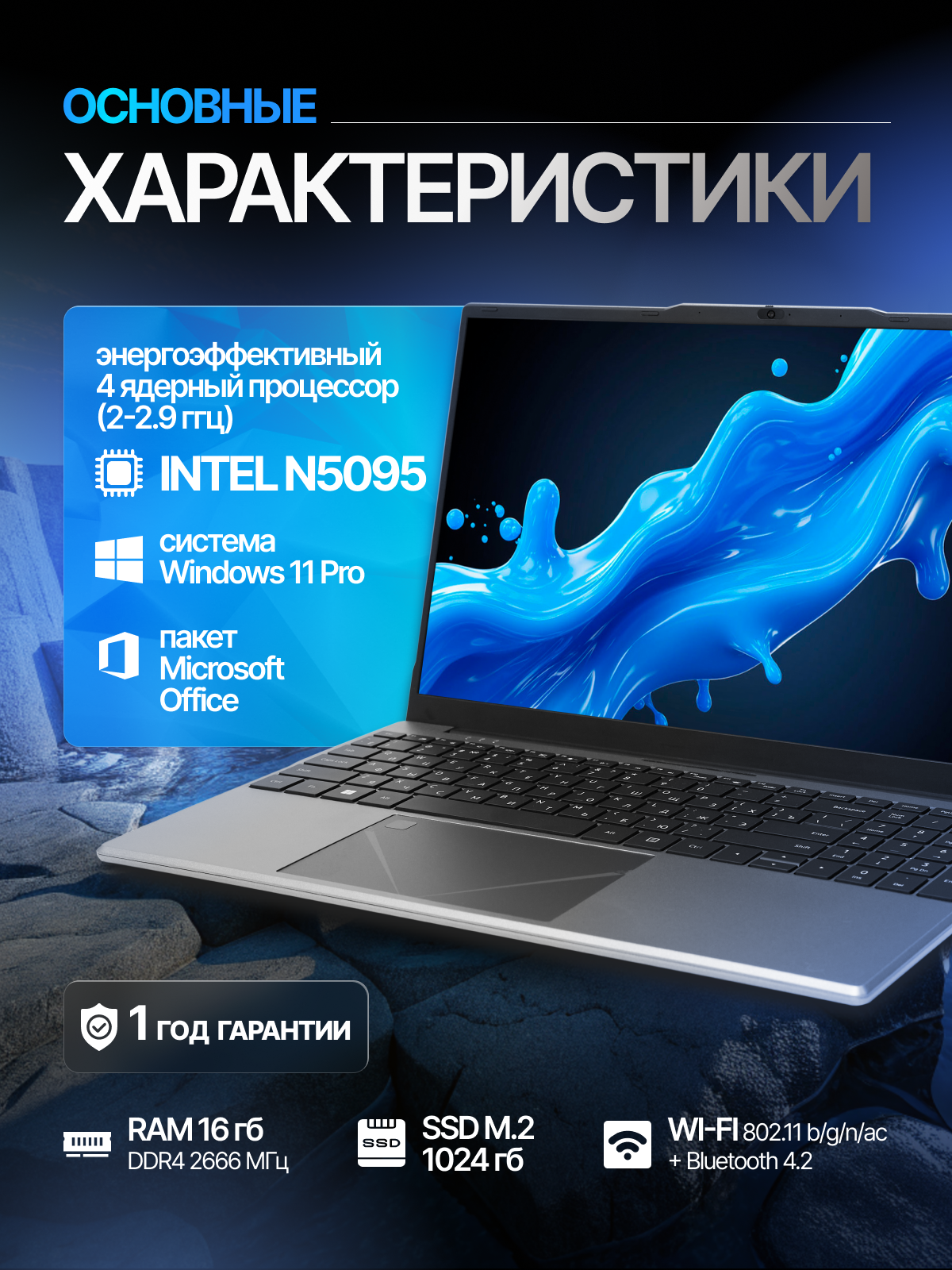 Новый ноутбук в заводских пленках в красивом сером цвете (SpaceGray). Компактный, легкий, мощный ноутбук N5095. Идеальное решение для деловых людей! Ноутбук оснащен мощным 4 ядерным процессором Intel Celeron N5095 с частотой до 2.9 ГГц и оперативной памятью объемом 16 GB, которые позволят вам не только заниматься серфингом в интернете, но и устанавливать на него мощные программы по обработки фото и видеоизображений, а встроенная видеокарта Intel UHD Graphics в совокупности с большим объемом оперативной памяти и мощным процессором позволит вам без потери производительности и FPS играть в большинство видеоигр среднего сегмента, таких как " World of tanks", " dota 2", " CS GO" и др. Встроенный SSD объемом 1024 GB обеспечит быстрою загрузку операционной системы и обмен данных на ноутбуке. Встроенная батарея мощностью 5000 мАч, позволяет ноутбук автономно работать до 6 часов. Комплект: Ноутбук, блок зарядки.