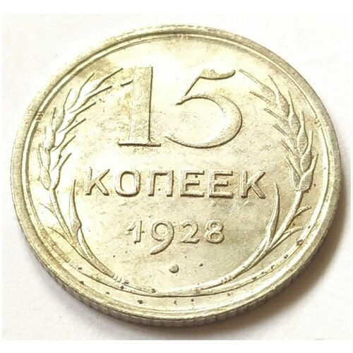 На реверсе вверху имеется крупное число "15", указывающее номинал, под ним - слово "копеек", отцентрированное относительно номинала. Ниже - год выпуска - "1928", ещё ниже имеется круглая точка. По бокам вдоль канта расположены два пшеничных колоса, скрещенных внизу. Стебли колосьев имеют продолжение, проходят вдоль канта в верхней части монеты и соединяются вместе. Вдоль стеблей имеется 7 участков, состоящих из 2 точек.