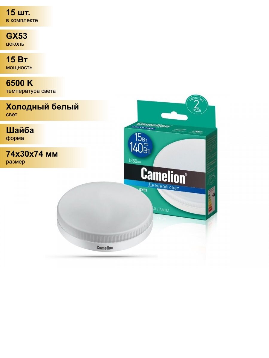(15 шт.) Светодиодная лампочка Camelion GX53 св/д 15W(1350lm 120°) 6500K 6K матовая 30×74 LED15-GX53/865/GX53 Холодный белый. Цоколь GX53