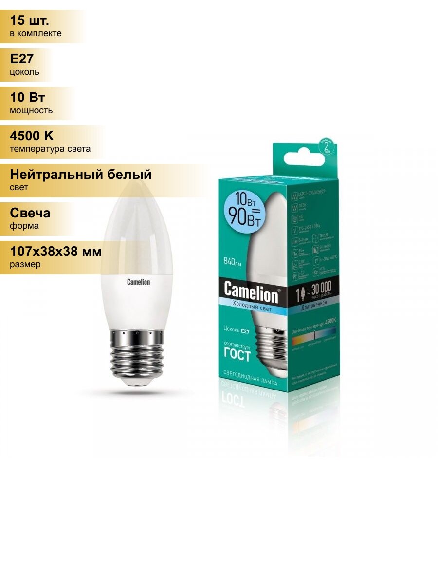 (15 шт.) Светодиодная лампочка Camelion Свеча E27 10W(840lm 220°) 4500K 4K матов. 107×38 пластик LED10-C35/845/E27 Нейтральный белый. Цоколь E27: сравнение цен, характеристики, фото, актуальное наличие и цены.