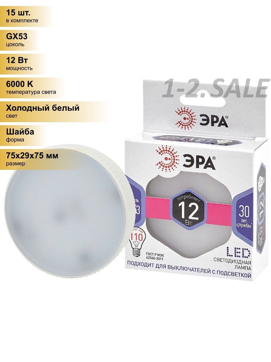 (15 шт.) Светодиодная лампочка ЭРА стандарт GX53 12W(960Lm) 6000K 6K 29х75 GX-12W-860-GX53 9027 Холодный белый. Цоколь GX53: сравнение цен, характеристики, фото, актуальное наличие и цены.