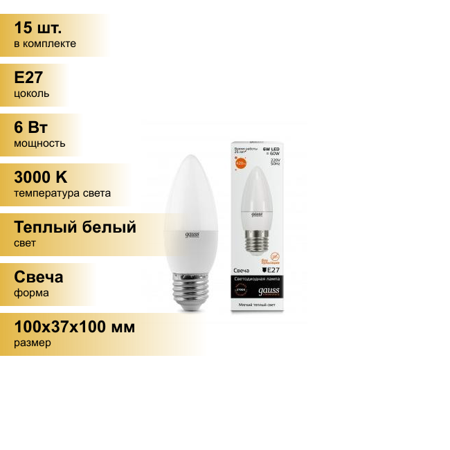 (15 шт.) Светодиодная лампочка Gauss Elementary Свеча E27 6W(420lm) 3000K 2K 100×37 матовая, пластик/алюм. 33216 Теплый белый. Цоколь E27: сравнение цен, характеристики, фото, актуальное наличие и цены.