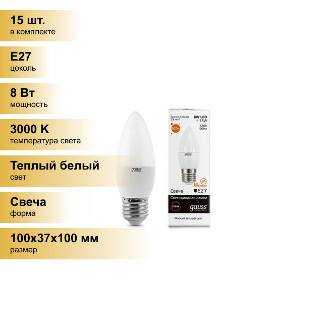(15 шт.) Светодиодная лампочка Gauss Elementary Свеча E27 8W(520lm) 3000K 2K 100×37 матовая, пластик/алюм. 33218 Теплый белый. Цоколь E27: сравнение цен, характеристики, фото, актуальное наличие и цены.