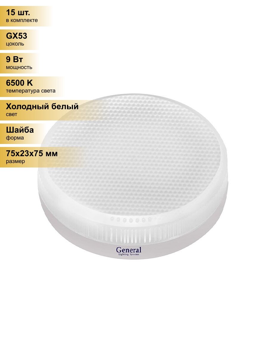 (15 шт.) Светодиодная лампочка General GX53 9W 6500K 6K 75×23 призма пластик GLDEN-GX53-9-230-GX53-6500 660364 Холодный белый. Цоколь GX53: сравнение цен, характеристики, фото, актуальное наличие и цены.