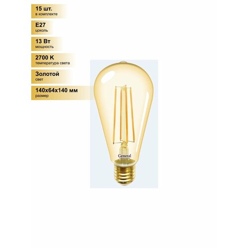 (15 шт.) Светодиодная лампочка General LOFT ST64S E27 13W 2700K 2K 64×140 филамент (нитевидная) золотая 655303 Золотой. Цоколь E27: сравнение цен, характеристики, фото, актуальное наличие и цены.