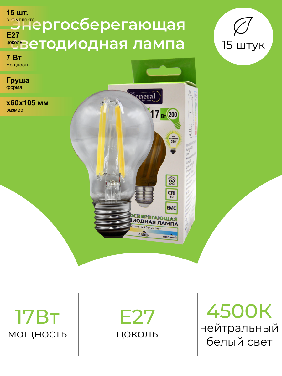 (15 шт.) Светодиодная лампочка General ЛОН A60 E27 17W 4500K 4K 60×105 филамент (нитевидная) прозр. 660320 Нейтральный белый. Цоколь E27: сравнение цен, характеристики, фото, актуальное наличие и цены.