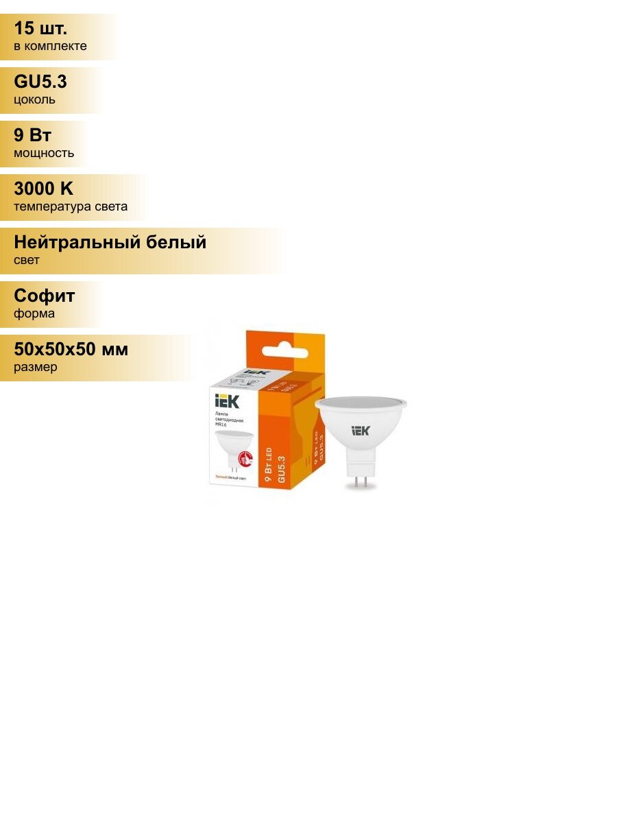 (15 шт.) Светодиодная лампочка IEK MR16 GU5.3 220V 9W(810lm) 3000К 2К 50×50 матов. LLE-MR16-9-230-30-GU5 Нейтральный белый. Цоколь GU5.3: сравнение цен, характеристики, фото, актуальное наличие и цены.