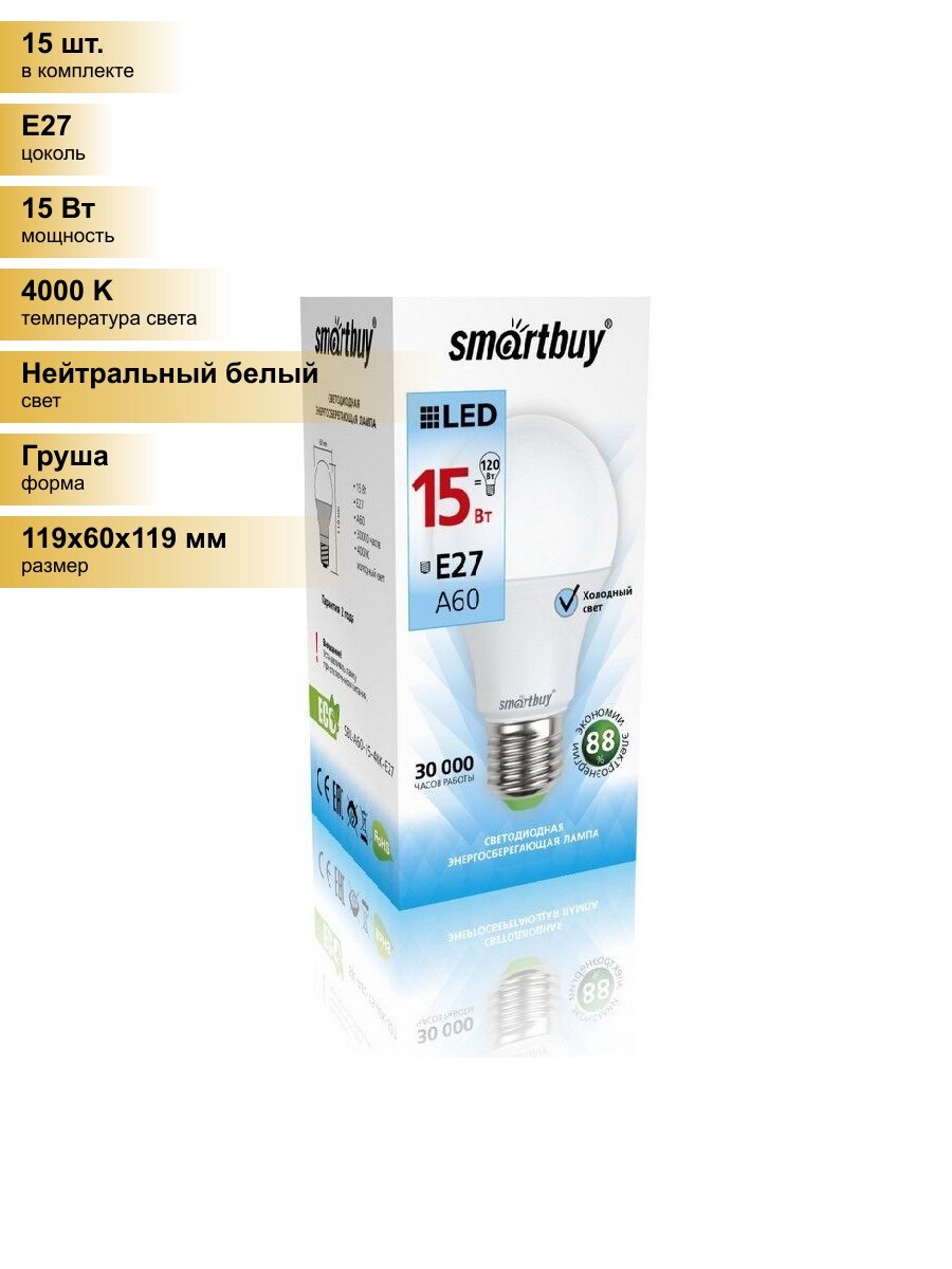 (15 шт.) Светодиодная лампочка Smartbuy ЛОН A60 E27 15W(1200lm) 4000K 4K 119×60 SBL-A60-15-40K-E27 Нейтральный белый. Цоколь E27: сравнение цен, характеристики, фото, актуальное наличие и цены.