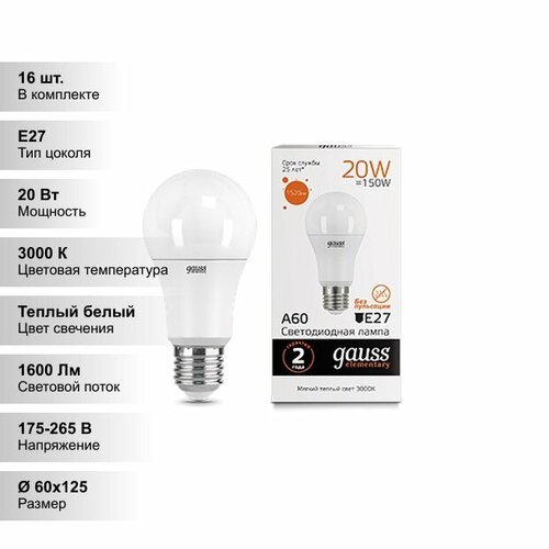 Gauss LED Elementary A60 20W E27 2700K/3000К Светодиодная лампа Gauss LED 23219 теплого свечения мощностью 20 Вт представляет собой энергосберегающий источник света, в котором светообразующими элементами являются диоды. Она изготовлена по европейским стандартам и относится к классу энергоэффективности «А+». Данная модель предназначена для внутреннего освещения общественных и производственных помещений, интерьерной декоративной подсветки, общего, локального, акцентного и аварийного освещения.