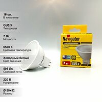 (16 шт.) Светодиодная лампочка Navigator MR16, мощность 7 Вт, напряжение питания 220 В, световой поток 595 Лм, цветовая температура 6500 K, холодный белый свет, цоколь GU5.3, размер Ø50х52 мм: сравнение цен, характеристики, фото, актуальное наличие и цены.