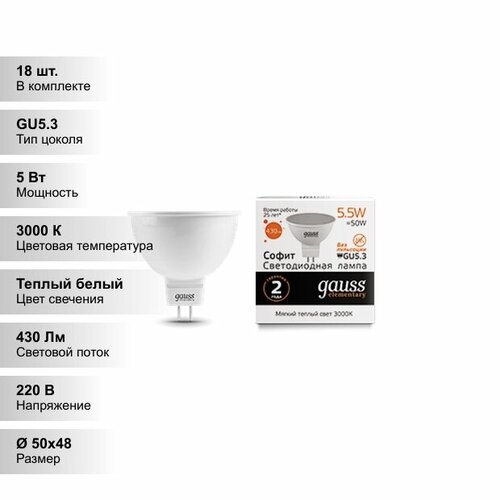 (18 шт.) Светодиодная лампочка Gauss MR16, мощность 5.5 Вт, напряжение питания 220 В, цветовая температура 3000 К, теплый белый свет, световой поток 430 Лм, цоколь GU5.3, размер 50х50 мм: сравнение цен, характеристики, фото, актуальное наличие и цены.