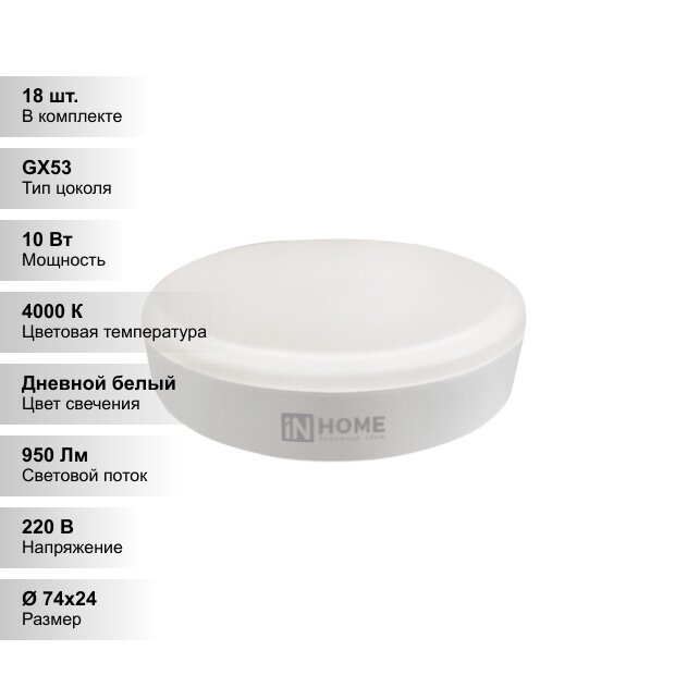Купить (18 шт.) Светодиодная лампочка IN HOME 10Вт 230В 4000К GX53 с доставкой по всей России. (18 шт.) Светодиодная лампочка IN HOME 10Вт 230В 4000К GX53: сравнение цен, характеристики, фото, актуальное наличие и цены.