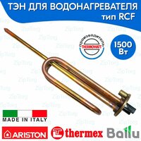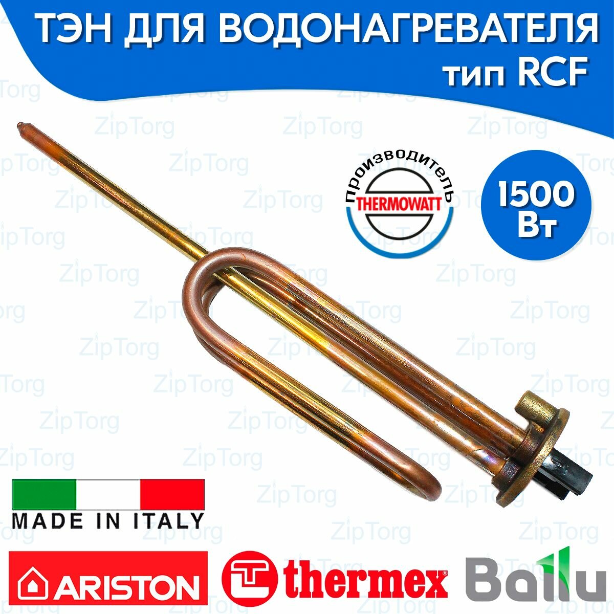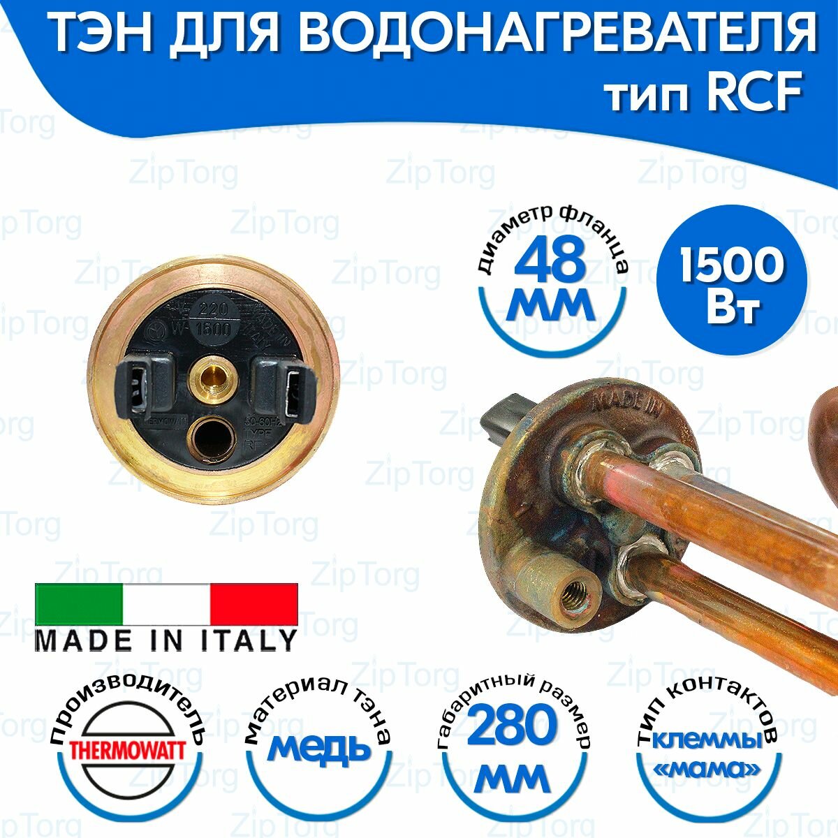 ТЭН типа RCF для водонагревателей Ariston, Ballu, De Luxe, Polaris, Thermex и др. мощностью 1,5кВт и напряжением 220В с местом под анод М6. Прижимной фланец с диаметром 48мм, в него впаян сам ТЭН и трубка под терморегулятор, внешний диаметр трубки ТЭНа 8,5мм, внутренний диаметр трубки под терморегулятор 6,5мм. ТЭН изготовлен из меди. Артикул - 184280. ТЭН типа RCF крепится в бак посредством круглого пятиболтового фланца D-75. Конструкция ТЭНов разработана специально для возможности быстрой сборки со стержневым термостатом. Производитель - Thermowatt (Италия).