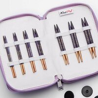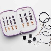 7 круговых спиц для вязания размером – 4.00, 4.50, 5.00, 5.50, 6.00, 7.00, 8.00 мм, поворотные на 360°, покрытые нержавеющей сталью лески длиной – 40 (2) и 50 cм (2) а также аксессуары в сумочке из фиолетовой ткани на молнии, идеальной для хранения и вязания во время путешествий. Аксессуары • 8 наконечников • 4 ключа для лесок