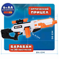 Купить 1toy Funmax «A82» бластер электромеханический, барабан на 30 выстрелов, в комплекте 48 EVA снарядов с доставкой по всей России.