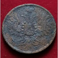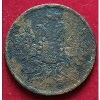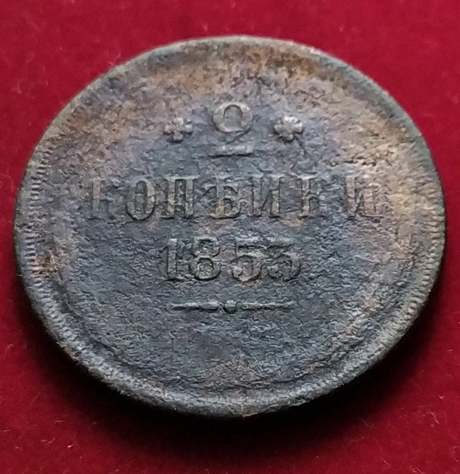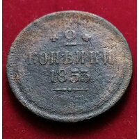 На реверсе монеты указан номинал в две строки: "2 копейки". По бокам цифры "2" имеется две звёздочки. Ниже - год чеканки "1853", ещё ниже расположена двойная линия с точкой в центре, под ней буквы "Е. М." (екатеринбургская монета). По кругу вдоль канта расположен венок из двух ветвей.