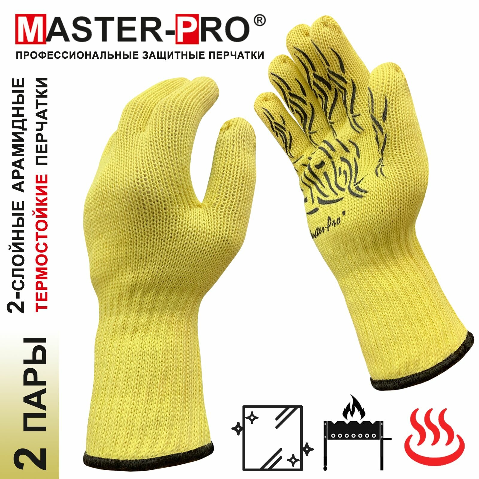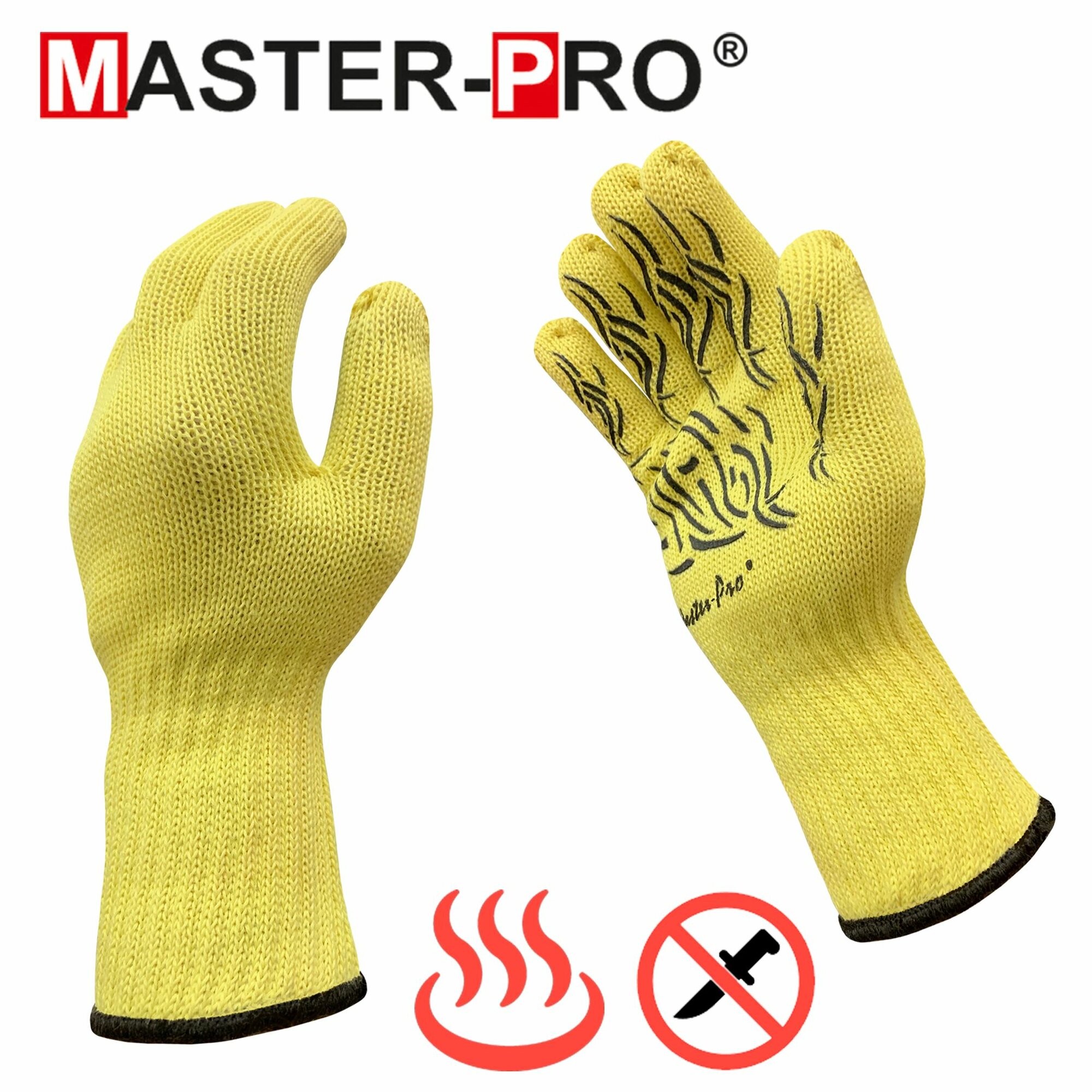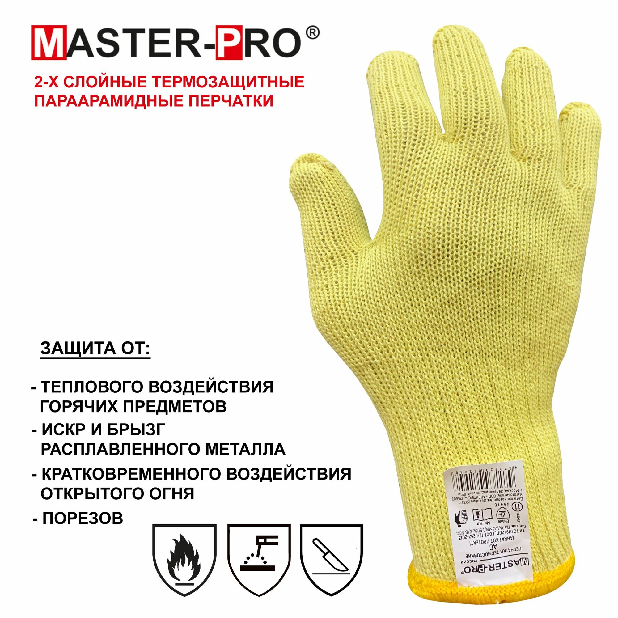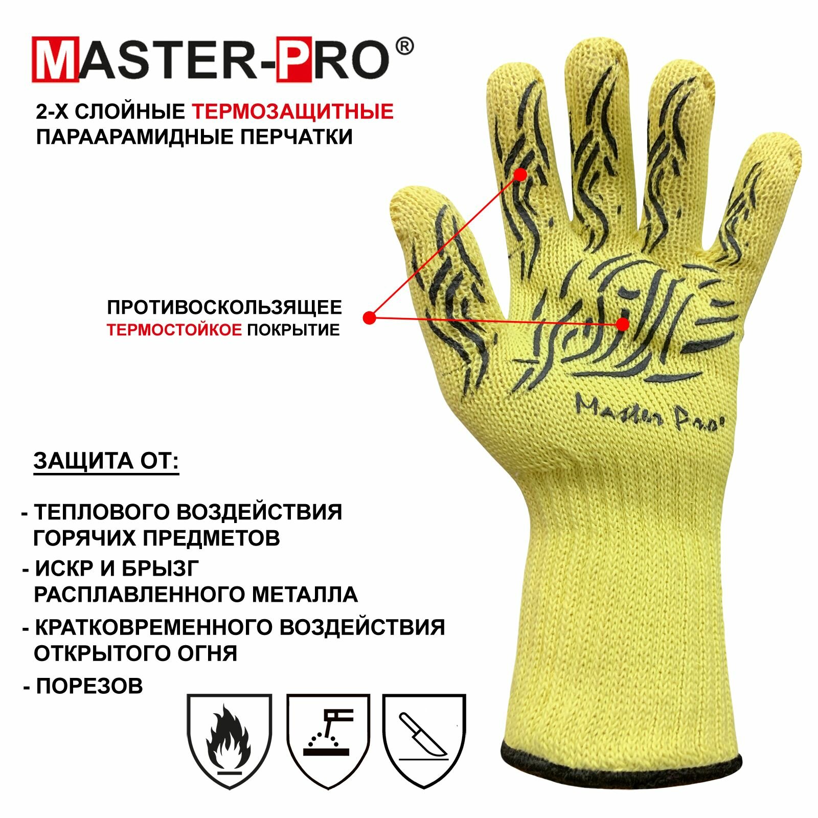 Перчатки термозащитные параарамидные (кевларовые) Master-Pro® анкат ХОТ протект являются средством защиты рук в опасных работах, связанных с опасностью порезов, истирания и контакта с раскаленными предметами - прямой контакт с раскаленными углями, мангалами, казанами и проч, ручная разделка мяса, птицы, рыбы, овощей и фруктов, металлообработка, работа со стеклом. Легкие, комфортные, с превосходным воздухообменом. Многократные режимы стирки (при t = 40°С с нейтральными моющими средствами) не меняют защитных свойств перчаток Master-Pro® анкат ХОТ протект.