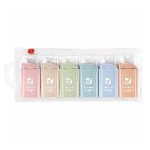 Корректирующая лента BRAUBERG COMPACT PASTEL – это незаменимый помощник для мгновенного исправления рукописных и печатных текстов. Набор из 6 штук в ПВХ-пенале в трендовых пастельных дизайнах – идеальный выбор для дома, офиса или учебы. С помощью корректирующей ленты BRAUBERG вы сможете легко и незаметно исправлять любые копии, тексты и документы. Она не требует времени на высыхание после нанесения, что делает её особенно удобной в использовании. Кроме того, она не оставляет следов и черных полос на документе при копировании или отправке по факсу, обеспечивая плотное и равномерное покрытие. Серия корректирующих лент BRAUBERG COMPACT PASTEL представлена в нежных пастельных цветовых сочетаниях. Её компактный размер и удобная форма позволяют легко хранить ленту в пенале или подставке для канцелярских принадлежностей. Общая длина одной ленты составляет 6 м, а ширина – 5 мм. Комплект из 6 штук поставляется в ПВХ-пенале с zip-замком. Ширина ленты: 5 мм. Длина ленты: 6 м. Серия: COMPACT PASTEL. Количество в комплекте: 6 шт. Цвет корпуса: пастельный ассорти. Упаковка: ПВХ-пенал с zip-lock Бренд - BRAUBERG. Производитель - Китай. . Штрихкод - 4606224433646