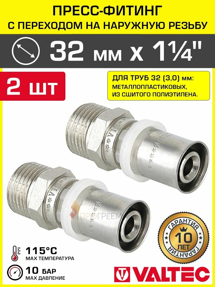 2 шт -Пресс-фитинг 32 мм х 1 1/4″ н. р. для труб из металлопластика и сшитого полиэтилена 32(3,0) VALTEC / Прямое пресс-соединение с переходом на наружную резьбу, арт. VTm.201. N.003207: сравнение цен, характеристики, фото, актуальное наличие и цены.
